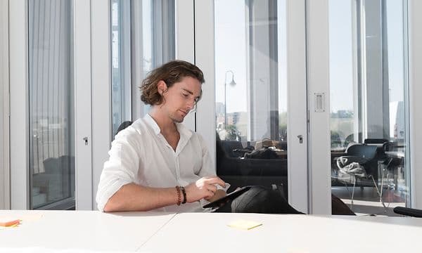 En mann sitter hjemme og jobber på en iPad