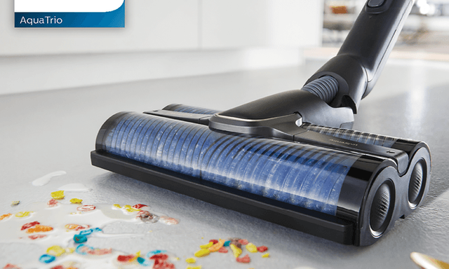 Les merPhilips AquaTrio 3-i-1 trådløs støvsuger og mopp fjerner enkelt støv, smuss, flekker, væske, søl og bakterier fra harde gulv.