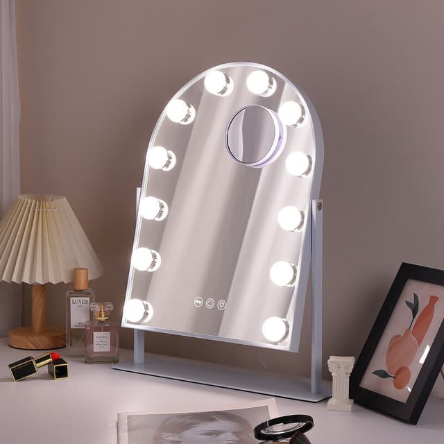 Sminkespeil med lamper rundt selve speilet gir en følelse av luksus og leverer studiokvalitetsbelysning. De er ideelle for profesjonelle make-up artister og skjønnhetsentusiaster som ønsker den ultimate glamourfølelsen.