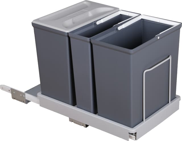 Kildesorteringssystemet Select 3 er et moderne system med flere beholdninger. Systemet monteres i underskap, og trekkes automatisk ut når døren åpnes.