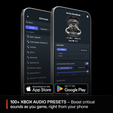 Disse pro GameBuds leveres med Sonar Surround-lyd og Microsoft Spatial for Xbox, slik at du ikke bare får en bedre romlig forståelse av slagmarken, men også kan nyte favorittfilmene og -sangene dine fullt ut.