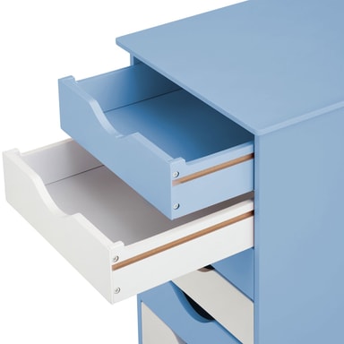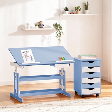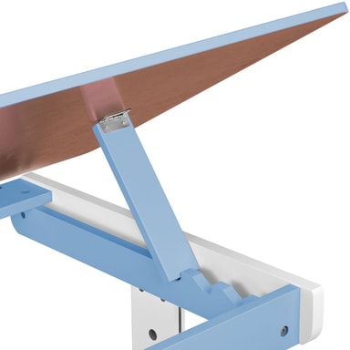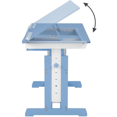 Det praktiske settet som består av et høydejusterbart skrivebord og en mobil beholder, tilbyr komfortabelt arbeid og nok oppbevaringsplass til skrivebøker, mapper, maling og mye mer. Oppgaver utføres med moro ved dette skrivebordet med integrert skuff. Arbeidsbordet kan vippes og er utstyrt med to avtagbare stoppstenger for å hindre at arbeidsmaterialer sklir av. Med tilhørende mobilcontainer er det alltid orden på arbeidsplassen, da alt materiell pent kan stues bort i de seks skuffene.