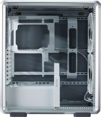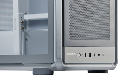 MasterFrame 500 Mesh har en markant, åpen ramme-estetikk laget av aluminium for styrke og lett holdbarhet. Sidepanelet i herdet glass viser frem komponentene dine, mens den modulære utformingen muliggjør enkel tilpasning og oppgraderinger. Med verktøyfri fjerning av paneler og en innebygd GPU-støttebrakkett er kabinettet designet for både stil og praktisk bruk.