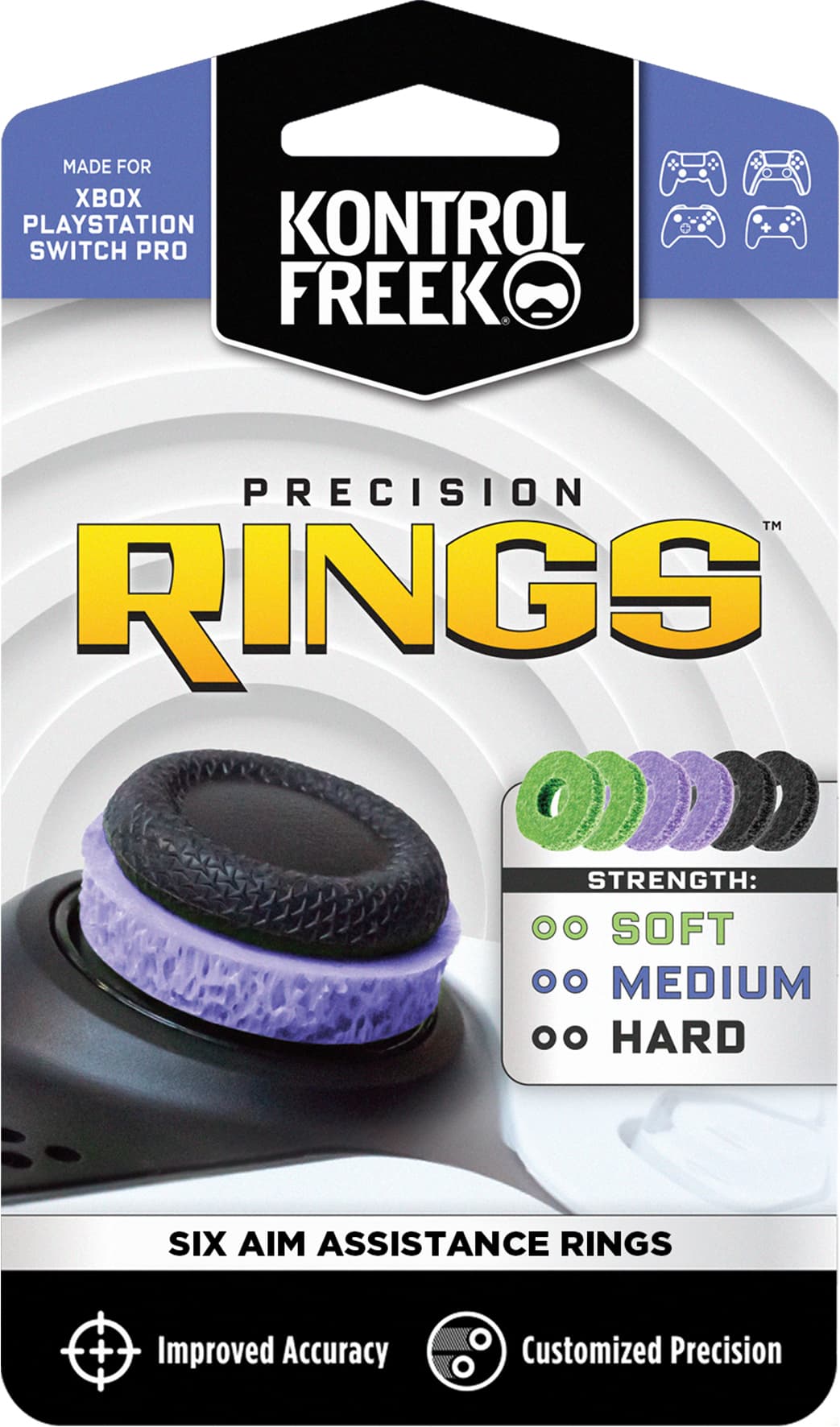 Kontrol Freek PS5 presisjonstommelringer forbedrer sikte med et unikt materiale som gir tommespakene ekstra motstand, tilbyr myk, middels og hard styrke, er antimikrobielle, elastiske og kompatible med Performance Thumbsticks for enda bedre kontroll.Les mer om produktet