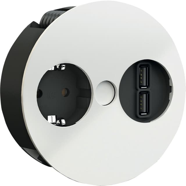 lav installasjonsdybde kun 40 mm. Kanthøyde 2,5 mm, innbyggingsmål 105 mm. Schuko stikkontakt barnesikret med jording. Kan sitte over en skuffeseksjon. Leveres med 2 m ledning og monterbart støpsel.