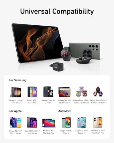 Anker 313 USB-C 45W Ace Lader tilbyr ultra-hurtig lading med opptil 45 W, slik at du kan lade en Samsung Galaxy S23 Ultra helt på mindre enn en time. Perfekt for å lade enhetene dine raskt og trygt. Utstyrt med 10 sikkerhetsfunksjoner, inkludert kortslutningsbeskyttelse, overspenningsbeskyttelse og temperaturkontroll, for å beskytte både deg og enhetene dine.Spesifikasjoner: