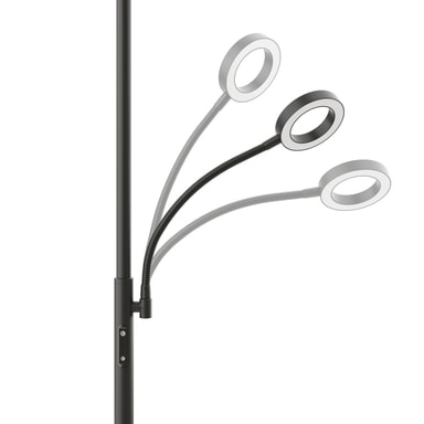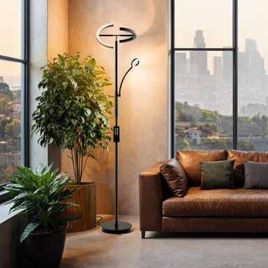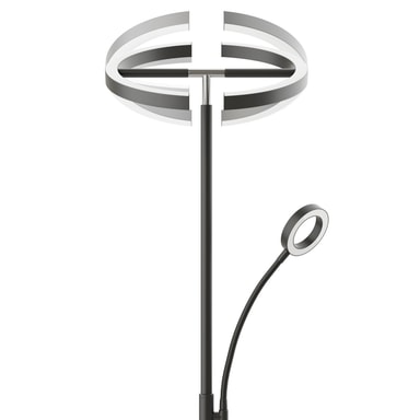 De stilige LED-buene kan roteres vertikalt opptil 350° og gir jevn belysning i alle retninger, mens den integrerte leselampen takket være den fleksible svanehalsen setter presise og myke lysaksenter. Den praktiske dimmefunksjonen og den justerbare fargetemperaturen skaper en behagelig atmosfære helt etter dine ønsker – enten det er for koselig avslapning eller et sterkt lys for arbeid.