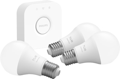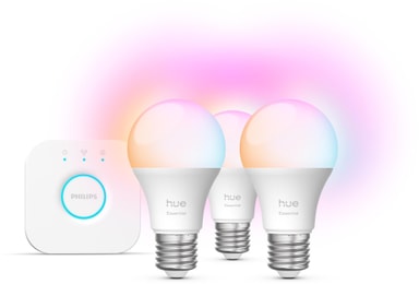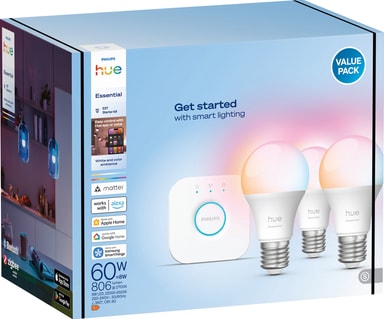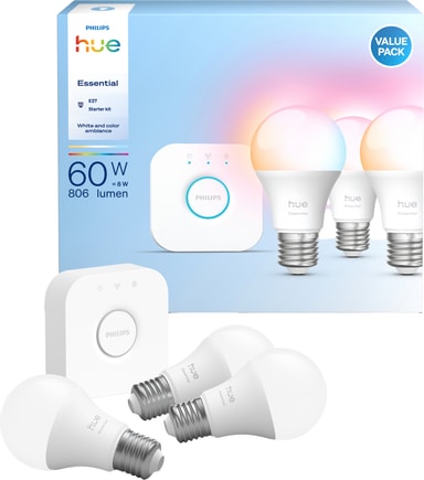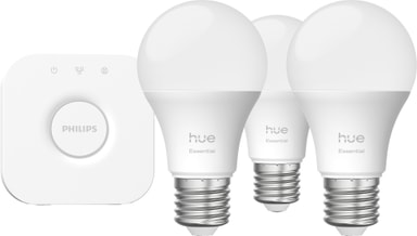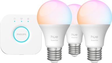 Philips Hue Essentials LED-pærer 3W, E27 er et sett som inneholder tre A60 E27 White and Color Ambiance-pærer og en Hue Bridge, som gir deg full kontroll over belysningen i hjemmet. Du kan enkelt veksle mellom varmhvitt, kjølige toner eller millioner av farger, dimme lysene eller velge blant forhåndsinnstilte scener designet av Hue. Hue Bridge kobler alt sammen og muliggjør app-kontroll, stemmestyring, smarte automatiseringer og muligheten til å styre lysene enten du er hjemme eller borte.