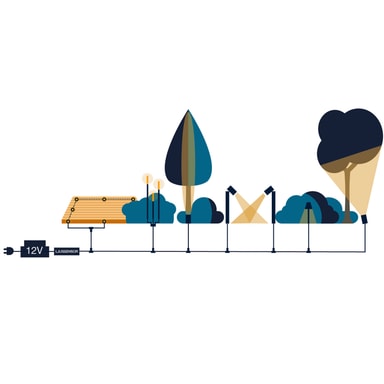 Et fleksibelt og rimelig 12-voltssystem (sikker svakstrøm) for hagen din, som du enkelt installerer selv og senere kan bygge på, opptil 50 meter, hvis du ønsker det. Lampene har varmt lys og skandinavisk design, tilpasset vårt klima her i nord.