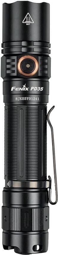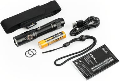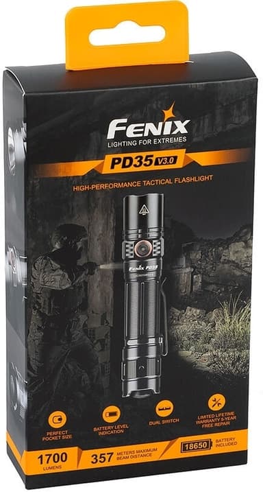 Fenix PD35 V3.0 er en tøff lommelykt som kan brukes overalt, med 1700 lumen og en rekkevidde på 357 meter, utstyrt med en tommelbryter. Lommelykten kan drives av enten det medfølgende oppladbare 18650-batteriet med mikro-usb-port eller to CR123A-batterier. Med 5 lumen i øko-modus har lommelykten en brukstid på svimlende 230 timer. Lommelykten har en batterinivåindikator som viser batteriets ladenivå når den er slått på. På/av og midlertidig på/av gjøres med en praktisk tommelbryter. De 6 ulike lysstyrkenivåene kan velges via en metallbryter på siden.