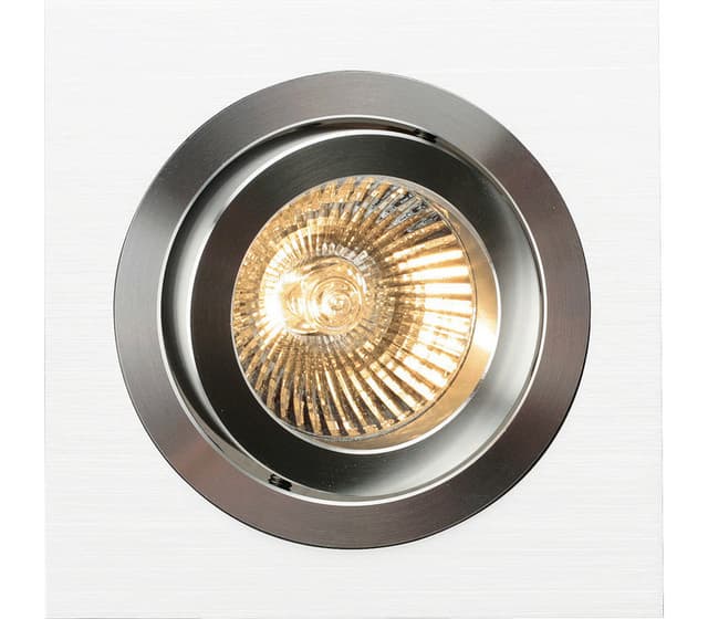 Downlights innfelt firkanet i fin aluminiumfinish. Enkel montasje og lampeskift. Den indre ringen er 175 graders roterbar. 45 graders tilt. 12V 35W Gu5,3. Ytre diameter: 92x92 mm. Innfellingshull: 81mm. Innfellinghøyde fra tak: 130 mm. IP21.