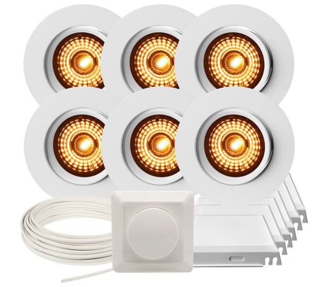 Komplett Alfa 360-tilt Warmdim downlightspakke med det du trenger for å montere 6 stk. Alfa downlights. Settet inneholder: 6 x Alfa 360-tilt Downlight Warmdim 8W matt hvit, IP44. LED-downlight med WarmDim, 520 lm på 8W. Lyset kan dimmes helt ned flimmerfritt og har en lav profil. Kan roteres i alle retninger og tiltes opptil 20 grader. 6 x Lavtbyggende og justerbar innfellingsboks for downlight fra Namron Kan justeres fra 370mm til 570mm. Høyde på kasse: 48mm. 1 x Downlightkabel RXKX 90 2X1,5 Snelle 25M Kabel for downlightanlegg med lederisolasjon og ytre kappe av blyfri PVC for maksimal driftstemperatur 90 °C. RXKX 90 er spesielt beregnet for downlight-belysning. 1 x Dimmer 250W 1-pol fra Namron 1-pol trykk og vri dimmer faseavsnitt som er egnet for LED, elektroniske trafoer og 230V halogen. Beskyttet mot kortslutning, overstrøm og overoppheting.Bruksområde: For bruk i de fleste rom hvor det ønskes god belysning. Montering: Hurtigkoblinger tilkobles før lampen settes inn. Spesifikasjoner: