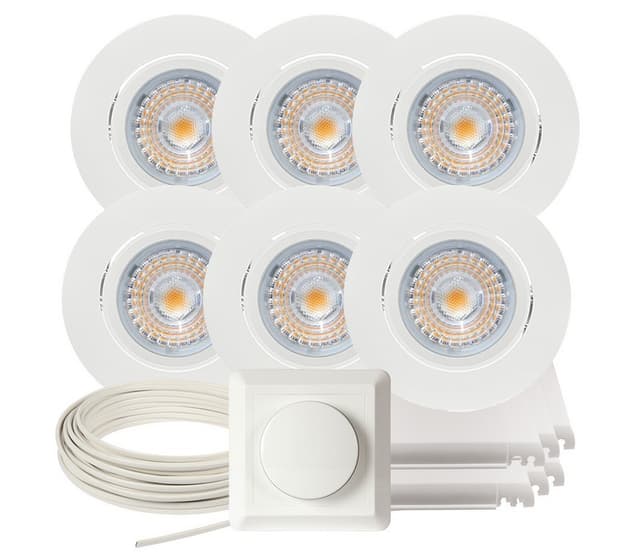 Komplett alfa downlightspakke med det du trenger for å montere 6 stk. Alfa downlights. settet inneholder: 6 x alfa led 10w i matt hvit, ip44. Pen lavtbyggende downlight som kan dimmes helt ned flimmer fritt og tiltes 35 grader. 700 lm og en ra verdi på 95+ gir et godt lys med en god fargegjengivelse. Utsparring: 82-84 mm. Øxh: 95x40 mm. 6 x lavtbyggende og justerbar innfellingsboks for downlight fra namron kan justeres fra 370mm til 570mm. Høyde på kasse: 48mm. 1 x downlightkabel rxkx 90 2x1,5 snelle 25m kabel for downlightanlegg med lederisolasjon og ytre kappe av blyfri pvc for maksimal driftstemperatur 90 °c. Rxkx 90 er spesielt beregnet for downlight-belysning. 1 x dimmer 250w 1-pol fra namron 1-pol trykk og vri dimmer faseavsnitt som er egnet for led, elektroniske trafoer og 230v halogen. Beskyttet mot kortslutning, overstrøm og overoppheting.bruksområde: for bruk i de fleste rom hvor det ønskes god belysning. montering: hurtigkoblinger tilkobles før lampen settes inn. spesifikasjoner: