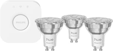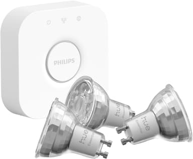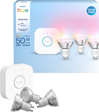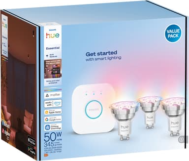 Philips Hue Essentials LED-pære 3W GU10 gir deg 3 smarte pærer. De tilbyr tilpassbar belysning med millioner av farger, justerbare hvittoner og forhåndsinnstilte lysscener. Hue Bridge muliggjør fjernkontroll og integrering med smarthussystemer.Les mer om produktet