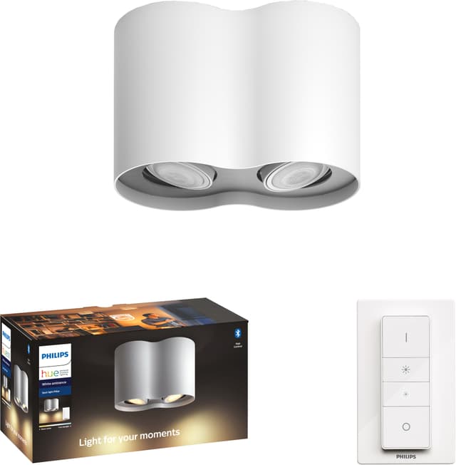 Skap en koselig hjemmeatmosfære med Philips Hue Pillar dobbelt spotlys. Belysningen kan dimmes, og spotlyset kan gjengi flott lys i både varmhvite og kaldere toner. For å tilpasse lysstyrken kan du bruke enten Bluetooth eller Hue-dimmebryter.Les mer om produktet