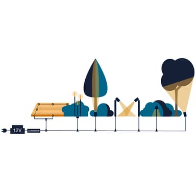 Et fleksibelt og rimelig 12-volts system (trygg lavstrøm) for hagen din, som du enkelt kan installere selv og senere bygge på, opptil 50 meter, hvis du ønsker det. Lampene har varmt lys og skandinavisk design, tilpasset vårt klima her oppe i nord.