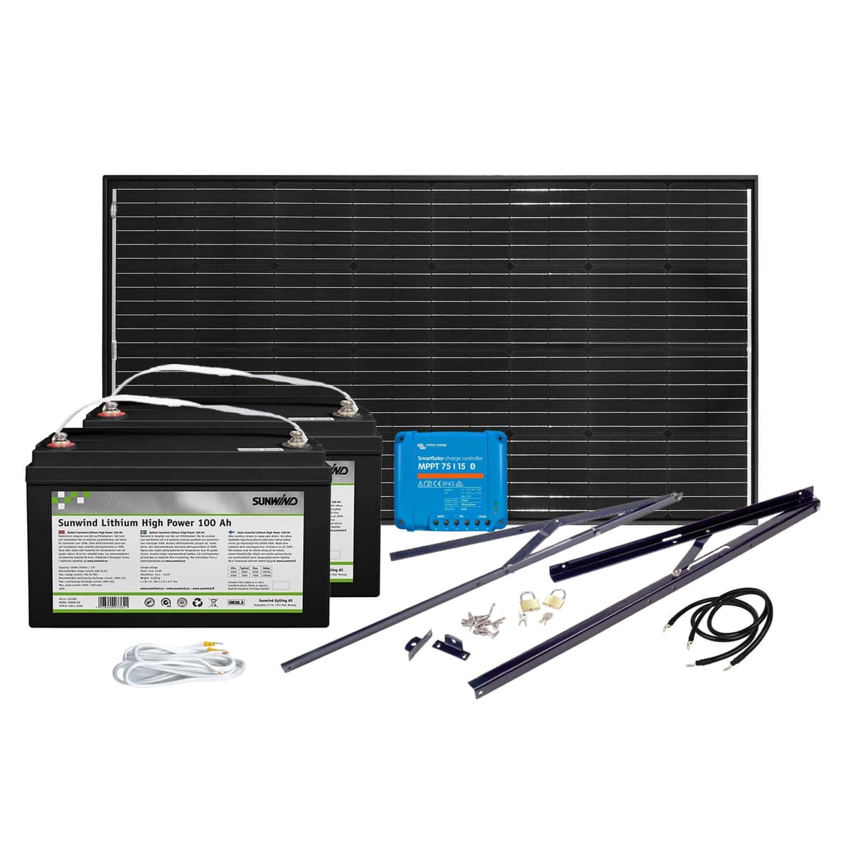 Solcelleanlegg på 12 volt med god ladekapasitet på 185 watt og god batterikapasitet med to Litium batterier på 100 At. Dette er en fin pakke til deg som benytter hytta mye på sommerstid, og trenger batterikapasitet til litt lengre forbruksperioder. Solcelleanlegget inneholder solcellepanel med justerbar brakett, to litium batterier og riktig dimensjonert solcelleregulator til anlegget. Monteringsmateriell må kjøpes ved siden av. I denne pakken medfølger et 185 watt Max Power solcellepanel. Max Power er markedets mest effektive solcellepaneler, og leveres med 30 års effektgaranti. Vi anbefaler at du monterer solcellepanelet på sydvendt vegg. Du får også med to 100 At Sunwind Litium High Power batterier.