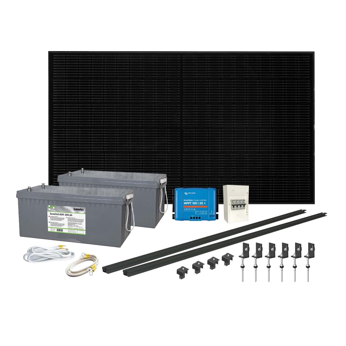 Solcelleanlegg på 12 volt med svært god ladekapasitet på 430 watt og god batterikapasitet med to store AGM batterier. Dette er en fin pakke til deg som benytter hytta hele året, og trenger batterikapasitet til litt lengre forbruksperioder, samtidig som solpanelet sørger for god lading under oppholdet. Solcelleanlegget inneholder solcellepanel med justerbar brakett, to 260 At AGM batterier og riktig dimensjonert solcelleregulator til anlegget. Monteringsmateriell må kjøpes ved siden av. I denne pakken medfølger et 380 watt Sunwind Grid solcellepanel. Sunwind Grid 380 er et solcellepanel av svært god kvalitet utstyrt med half-cut celler som gjør at det vil lade godt selv om deler av solcellepanelet er plassert i skyggen. Vi anbefaler at du monterer solcellepanelet på sydvendt vegg. Du får også med to 260 At Sunwind AGM batterier som både har god lademottagelighet og er fullstendig vedlikeholdsfrie. I tillegg får du en solcelleregulator Victron SmartSolar MPPT 100/30 som er egnet sammen med dette solcellepanelet og batteriet.
