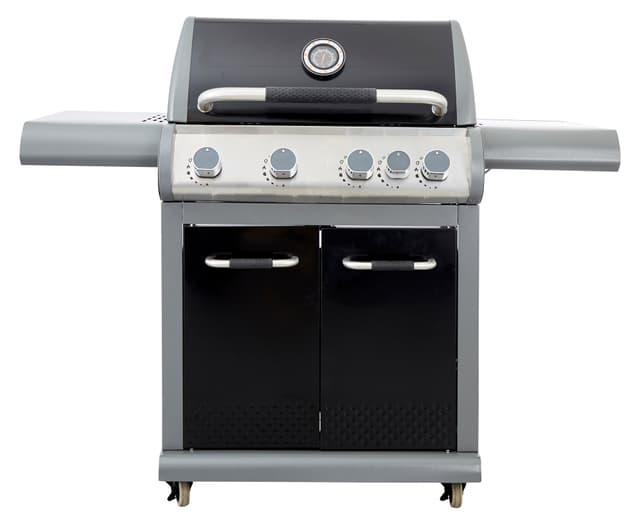 Stor gasgrill med 4 brændere i stærkt rustfrit stål, 1 stk. sidebrænder og dobbelt låg i sort emaljeret stål. Grillen har nogle fede detaljer, som passer ind i enhver have og der er tænkt over alle detaljer, lige fra de silikonebelagte greb til magneterne i skabene og den gode bordplads med overfladen, der er nem at gøre ren. Optændingen sker automatisk når du drejer på knapperne og starter flammerne, som slikker sig op gennem den store grill flex madlavningsrist i støbejern. Grillen kommer med 4 flammetæmmere i emaljeret stål, varmehylde i emaljeret stål og et madlavningsareal på 71 x 45 cm.
