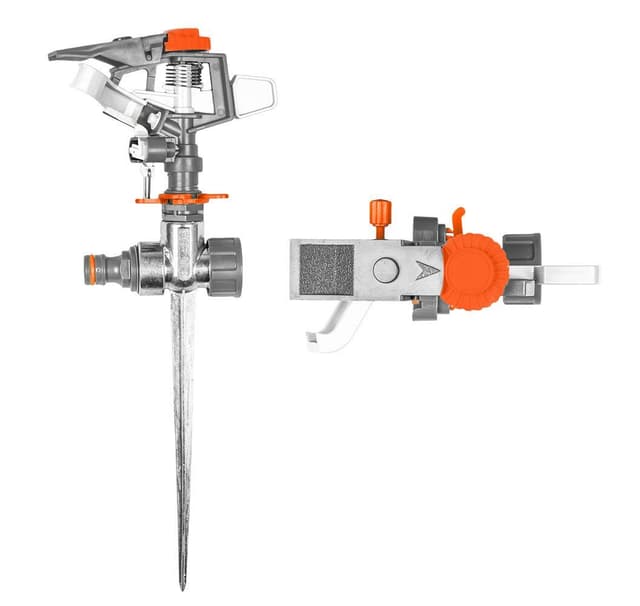 Pulserende sprinkler på metallpigg laget av høykvalitets materiale. Justerbar størrelse og form på vanningsområdet. Blokkering for vanning av valgt segment. Spike har koblingskobling og tillater enhet til enhet tilkoblinger.