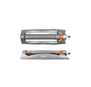 Variabel bredde oscillerende sprinkler- dekning opp til 375m2- 18 gummidyser- seks koblingsbare (på/av) sprøytedyser- vannstrømskontroll- glidende tapper gir enkel rekkeviddejustering- nåleplugg for dyserengjøring