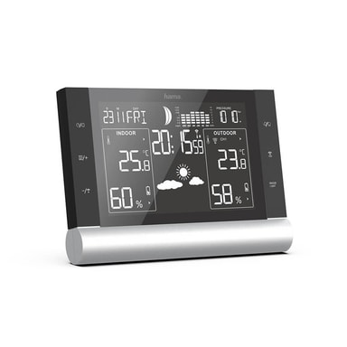 To-delt sett med en basestasjon og en trådløs utendørssensor for visning av tid, dato, temperatur, luftfuktighet og værmelding.
