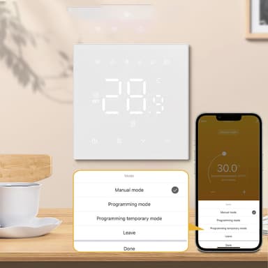 Flere moduser: Denne termostaten tilbyr en rekke moduser som passer din livsstil. Velg mellom manuell modus for direkte temperaturjusteringer, programmeringsmodus for å sette opp ukentlige varmeplaner, midlertidig programmeringsmodus for å overstyre planen når det trengs, og bortemodus for energisparing mens du er ute. Fleksibiliteten til disse modusene sikrer at varmesystemet ditt alltid er optimalisert for din komfort og energieffektivitet. Bytt enkelt mellom moduser via appen eller termostatens intuitive grensesnitt.