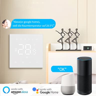 Smart kontroll: Administrer enkelt hjemmets elektriske gulvvarme med vår WiFi-aktiverte smarte termostat. Kontroller temperaturen fra hvor som helst ved hjelp av Tuya-appen på smarttelefonen eller nettbrettet. Nyt bekvemmeligheten av å justere varmeplanen din mens du er på jobb, på ferie eller bare slapper av på sofaen. Det intuitive app-grensesnittet gir enkel programmering og overvåking av varmesystemet ditt, og sikrer optimal komfort og energisparing. Kompatibel med stemmekontroll-systemer for betjening uten hender.