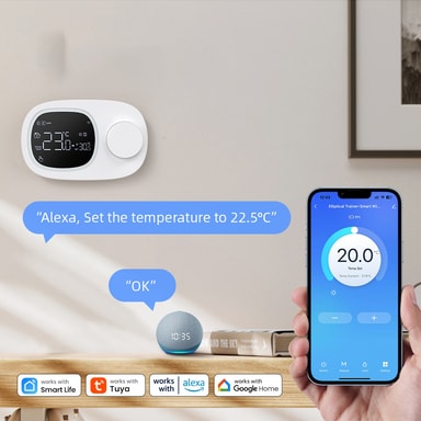 Stemme- & Appkontroll: Integrer termostaten sømløst med ditt smarthjemsøkosystem. Kompatibel med stemmeassistenter, kan du kontrollere temperaturen med enkle talekommandoer. Tuya Smart Life-appen gir ytterligere kontroll- og overvåkingsalternativer, slik at du kan finjustere innstillingene dine og spore energibruken din over tid. Denne kombinasjonen av stemme- og appkontroll gir optimal fleksibilitet og bekvemmelighet.