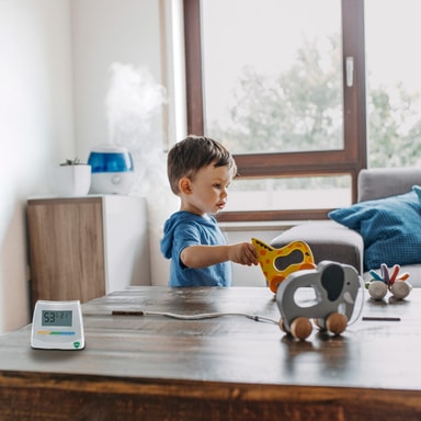 - Bidrar til å opprettholde en luftfuktighet på mellom 40-60 %, som er det optimale nivået for å redusere virus på overflater og i luften*