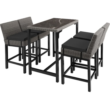 Skap et stilig sommersted i uteområdet ditt med det sjarmerende Kutina barbordet og de fire komfortable Latina barkrakkene fra tectake. Det smakfulle flettemønsteret og det estetiske marmorutseendet til bordplaten gir et snev av middelhavsteft. Fargen på det avtagbare trekket er perfekt koordinert med settet og, i kombinasjon med de brede ryggstøttene og de komfortable fotstøttene, imponerer det når det gjelder komfort over hele linja. Takket være de solide trebena og den solide aluminiumsrammen scorer det lettstelte ensemblet høyt – bytt til avslapningsmodus med dette innbydende utendørssettet fra tectake.