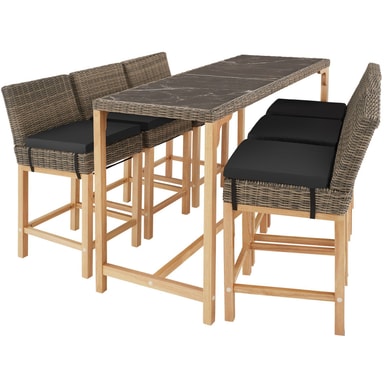 Dette sjarmerende barsettet fra tectake samler opptil seks personer på de komfortable stolene rundt det store bordet med sin stilige overflate i marmorlook. Det allsidige ensemblet gis ekstra eleganse av høykvalitetsvevingen, som er villedende basert på naturlig rotting. Tverrstenger fungerer som praktiske fotstøtter og sørger sammen med brede ryggstøtter og avtakbare sitteputer for utmerket komfort. Materialene som brukes gjør det syvdelte møbelsettet spenstig, holdbart og værbestandig, noe som gjør det ideelt for hagen, terrassen eller balkongen.