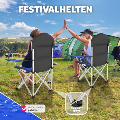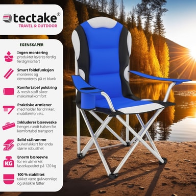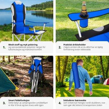 Denne campingstolen er en perfekt ledsager til alle dine fritidsaktiviteter, uansett om det handler om campingutflukter, fiske, strandferie eller i hagen. Len deg tilbake, nyt roen og naturen i denne sammenleggbare campingstolen. Den komfortable foringen gjør det enda bedre. Kalde drikker kan du enkelt plassere i den innebygde drikkeholderen. Etter en avslappende dag, kan du rett og slett legge sammen stolen og ta den med hjem i den medfølgende bærevesken.