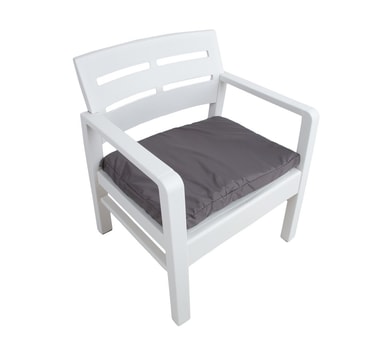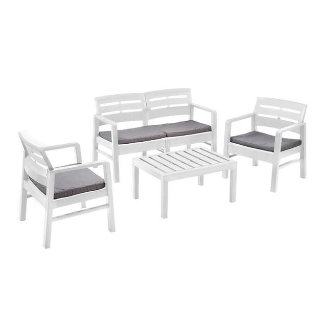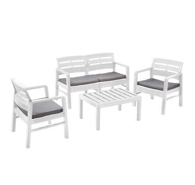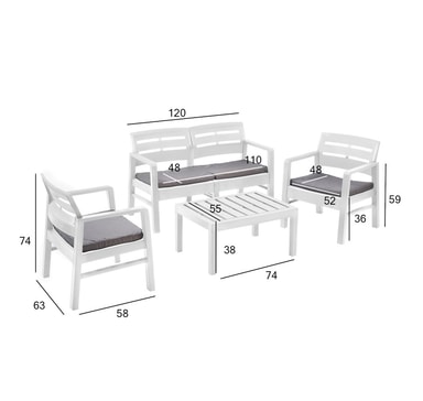 Hagemøbelsett JAVA bord, benk, 2 stoler, hvit plast. Målene på benken er 120x58xH74cm, målene på stolen er 63x58xH74cm, setedybde 48cm, og setehøyde 37cm. Settet inkluderer 4 sitteputer. Målene på puten er 54x45x4cm. Målene på bordet er 74x55xH38cm. Vektgrensen per sete er 120 kg. Materiale: polypropylen (PP). VEDLIKEHOLD: plastmøbler krever ikke spesielt vedlikehold. Rengjør overflatene regelmessig med en løsning av vann og et mildt rengjøringsmiddel. Ikke bruk blekemidler eller skurende rengjøringsmidler. OPPBEVARING: på slutten av sommersesongen anbefaler vi å oppbevare hagemøblene innendørs. Rengjør og tørk møblene før de lagres. Bruk et tørt, godt ventilert rom for oppbevaring.