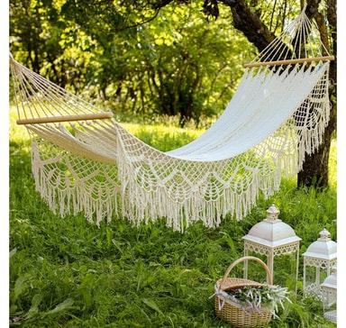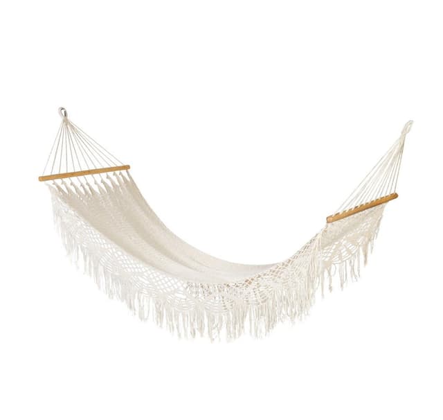 Hengekøye EL TUNCO naturhvit. Hengekøyen er håndlaget av håndverkere fra El Salvador, med respekt for den eldgamle kulturen og tradisjonelle teknikker. Kantene på hengekøyen vevd av bomullssnor er dekorert med rike håndheklede blonder. Polyestersnorer sikrer bedre holdbarhet og styrke på hengekøyen. Husken kan monteres mellom to trær eller stolper. Det er også mulig å bruke et spesielt hengekøyestativ for å henge husken opp. Avstanden mellom festepunktene skal være minst 25-30 cm lengre enn huskens totale lengde. Dimensjonene på husken er 127x230 / 320cm, maksimal lastekapasitet er 120kg. VEDLIKEHOLD: For å forlenge levetiden til produktet er det viktig å beskytte det mot vær og vind. Holdbarheten til stoffet og snorene reduseres på grunn av UV-stråling og overdreven fuktighet, og fargene blekner. Vi anbefaler alltid å oppbevare husken i et tørt og godt ventilert rom etter bruk. La husken tørke helt før du oppbevarer den. Håndvask på 40 grader er tillatt. Bruk milde vaskemidler.