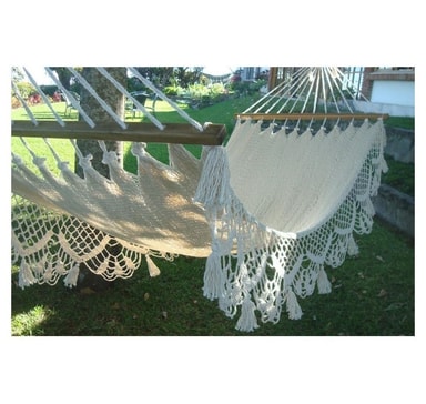 Hengekøye EL TUNCO naturhvit. Hengekøyen er håndlaget av håndverkere fra El Salvador, med respekt for den eldgamle kulturen og tradisjonelle teknikker. Kantene på hengekøyen vevd av bomullssnor er dekorert med rike håndheklede blonder.Les mer om produktet
