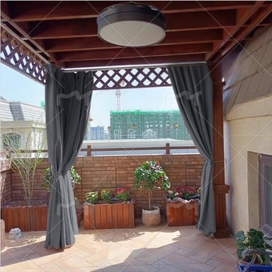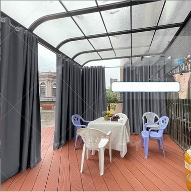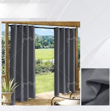 UV-bestandig og værbestandig: Disse utendørsgardinene er laget av polyester av høy kvalitet og er designet for å tåle elementene. De gir eksepsjonell beskyttelse mot falming fra langvarig soleksponering, og sikrer langvarig farge og ytelse. Det værbestandige stoffet avviser vann og forhindrer muggvekst, noe som gjør dem perfekte for en rekke utendørsmiljøer.