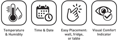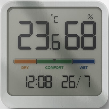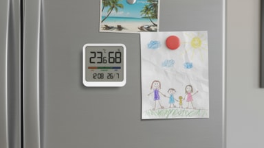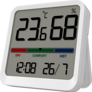 Apt hygrometer og termometer viser innetemperatur, luftfuktighet og komfortnivå med klokkeslett- og datovisning. Det er kompakt og nøyaktig, og inkluderer magnet, stativ og selvklebende pad for bruk på vegg, kjøleskap eller bord.Les mer om produktet