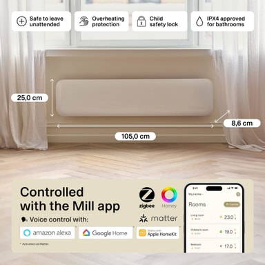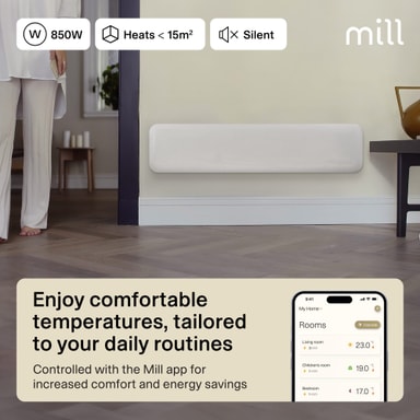 Styr hjemmets temperatur med Mill Invisible Smart Wi-Fi Gen 4 panelovn PA850LWIFI4, som er ideell for rom på 11-15 m². Den støtter Matter, Zigbee 3.0 og WiFi, og har funksjoner som Mill prediktiv oppvarming og Mill PID Wattage-teknologi, som tilpasser seg etter dine bruksvaner for optimal komfort.