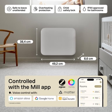 Mill Invisible Smart Wi-Fi Gen4 panelovn PA400WIFI4 er kompakt og varmer opp rom på opptil 6 m². Denne ovnen har en elektronisk termostat og er sikker for bruk i våtrom. For bedre kontroll kan den kobles til Mill Wi-Fi-appen.Les mer om produktet