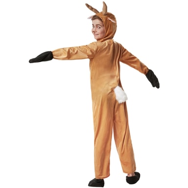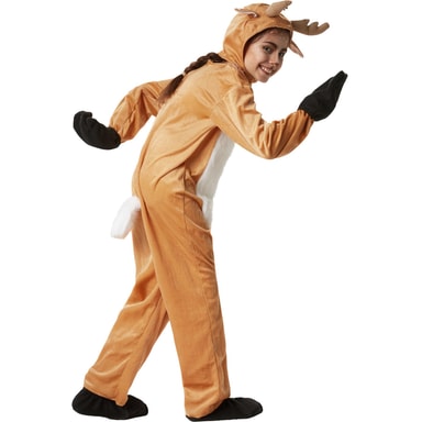 Unisexkostymet Lekent rådyr er i én del og består av en kjeledress, en hette, hansker og sko. Kostymet er fremstilt av okerfarget plysjstoff. På mage- og brystområdet er det en hvit kunstpels. Kjeledressen lukkes på baksiden ved hjelp av en lang glidelås. Under glidelåsen er det en liten hjortehale som ser svært ekte ut. Hetten åpnes og lukkes ved halsen ved hjelp av en borrelås. På hetten er det festet et par ører og et gevir. Kostymet fullendes med passende hansker og sko i mørk filt med elastisk linning, materiale: 100 % polyester.