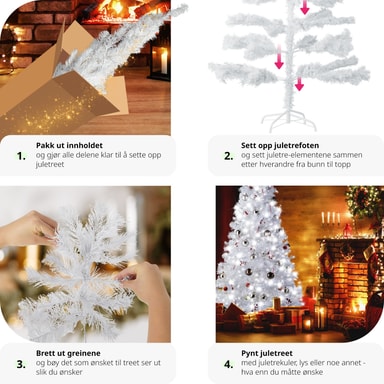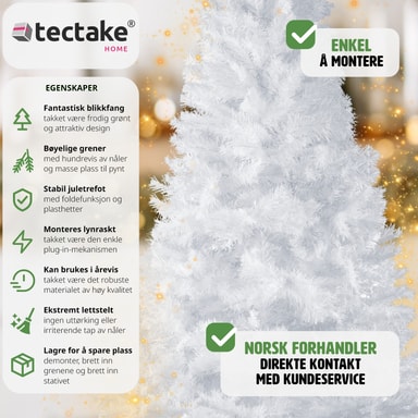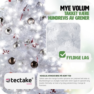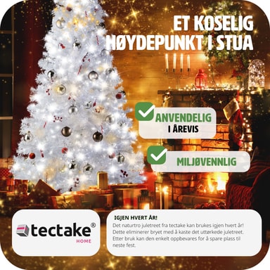 Med det kunstige juletreet fra tectake i hvitt kan du lage ditt eget julevinterland hjemme. Hundrevis av nåler gir det tette treet et veldig autentisk utseende. De bøyelige grenene gir god plass til dekorasjoner som lys eller fargerike julekuler, som tar seg spesielt godt ut på det hvite juletreet. Takket være det sammenleggbare og gulvvennlige metallstativet, kan monteringen fullføres med bare noen få trinn. I motsetning til et ekte tre mister ikke dette langtidsholdbare juletreet noen nåler og kan oppbevares for å spare plass etter festen – til neste bruk.
