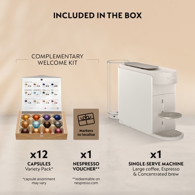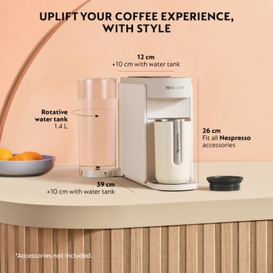 Nespresso Vertuo UP Bundle kapselmaskiner en hurtigoppvarmende kapselmaskin med en vanntank på 1,4 liter og Centrifusion-teknologi for fyldig kaffe og jevn crema. Den brygger 7 koppstørrelser fra 30+ varianter, inkluderer Coffee Creations-modus for sterkere drikker, leveres med en Aeroccino-skummer, kan kobles til Smart-appen og inkluderer 12 kapsler.