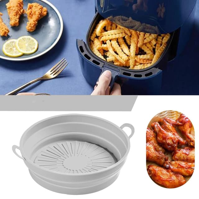 Rund form av livsmedelsgodkänd silikon. Den passar perfekt i fritösen och förhindrar klibbiga och brända matrester i din Air Fryer. Behållaren är återanvändbar och kan diskas i diskmaskin. Den upphöjda kanten håller maten på plats och fångar upp smulor och överflödigt fett. Formen kan komprimeras så att den tar mindre plats när den inte används.