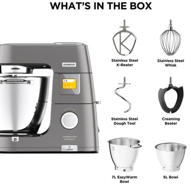 Kenwood Chef XL Titanium Patissier kommer med en EasyWarm-bolle med en kapasitet på sju liter, som lar deg tilberede store mengder deig på en gang. I tillegg inkluderer pakken en ekstra femliters bolle for flere matlagingsmuligheter.