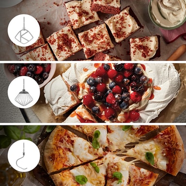 Denne MultiTasker-maskinen leveres med et omfattende sett med verktøy: blender, kjøkkenmaskin, sitruspresse, K Beater, visp og deigkrok. Med dette tilbehøret kan du mikse, elte, hakke, skjære, raspe, blande og presse juice med én og samme maskin.