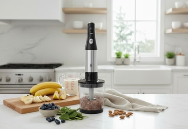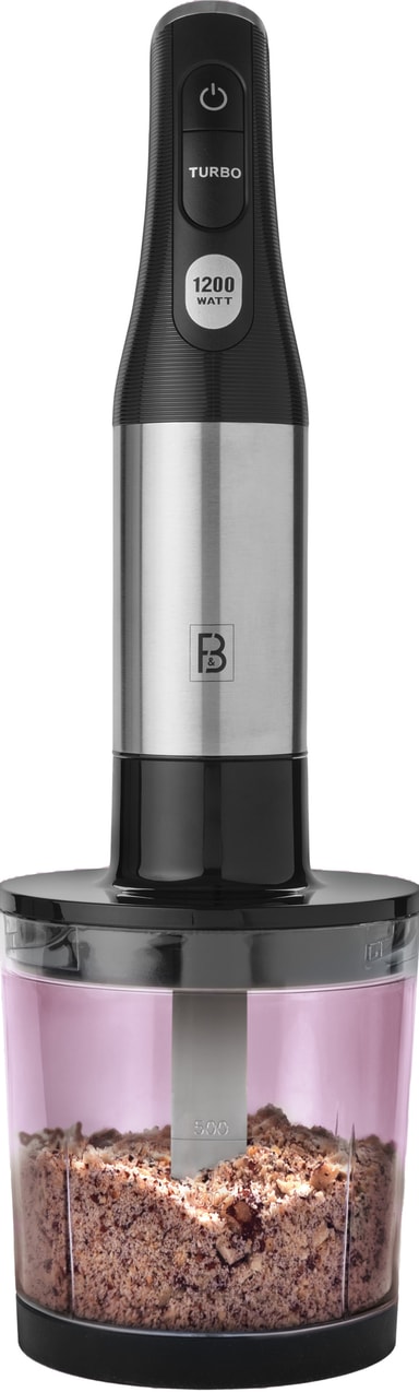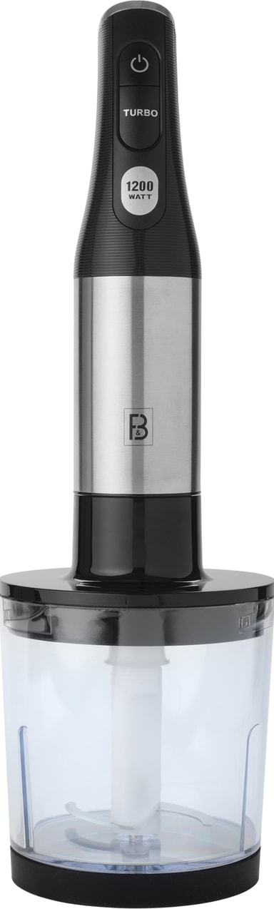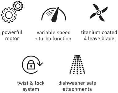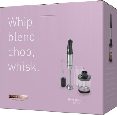 F&B stavmikser 73499 har 6-trinns kontroll, turbomodus og 6 titanbelagte blader for varme eller kalde ingredienser. Den inkluderer en 500 ml hakkerbolle, et 600 ml beger og en visp i rustfritt stål. Alle delene tåler oppvaskmaskin for enkel rengjøring.Les mer om produktet