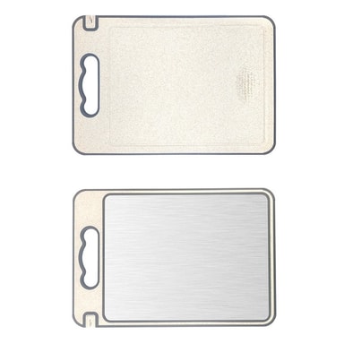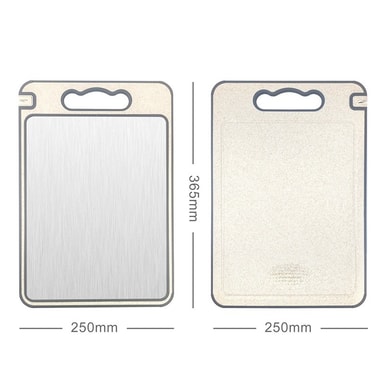Rustbestandig: Dette skjærebrettet er konstruert av høykvalitets 304 rustfritt stål og er svært motstandsdyktig mot rust og korrosjon. Dette sikrer at brettet holder seg i utmerket stand selv ved regelmessig eksponering for fuktighet og matsyre. De rustbestandige egenskapene til rustfritt stål gjør det til et langvarig og pålitelig valg for ethvert kjøkken. Du kan trygt bruke dette brettet til alle dine matlagingsbehov uten å bekymre deg for rust eller nedbrytning. PP- og hvetestråsiden er også designet for å motstå fuktighetsabsorpsjon, noe som ytterligere forbedrer brettets levetid.
