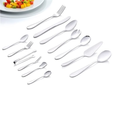 Spesifikasjon - Materiale: Høykvalitets rustfritt stål - Antall deler: 70 - Antall personer: Settet er nok til 12 personer - Inneholder: Kniver, gafler, skjeer, teskjeer og dessertskjeer