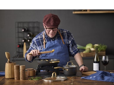 Brasserie-serien er laget av aluminium. Grytene og pannene har keramisk belegg på innsiden, svart belegg på utsiden og matte messingfargede håndtak og grepLes mer om produktet